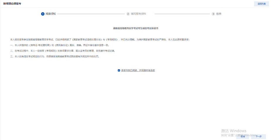 考生阅读完《阅读须知》后,勾选界面中显示的“承诺书我已阅读,并同意所有条款”复选框,等待界面右下侧倒计时按钮数据为0,显示“下一步”按钮后,点击“下一步”按钮跳转至“填写报考资料”界面。如下图所示: