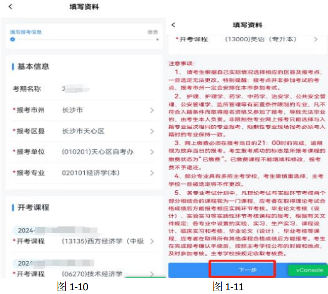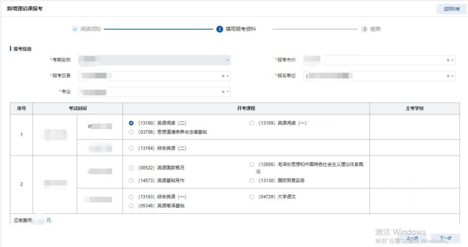 在“填写报考资料”界面,考生按要求选择所报考的地区信息(报考市州和报考区县)和报考专业信息,在所选的专业课程列表中选择本次需要报考的理论课程。