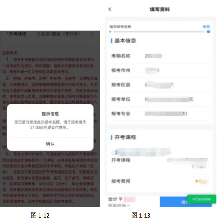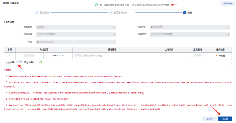 考生确认报考信息无误后,点击右下角“下一步”,系统会出现“您已暂时锁定此次报考名额,请于报考当天21:00前完成支付费用”提示信息,如下图所示: