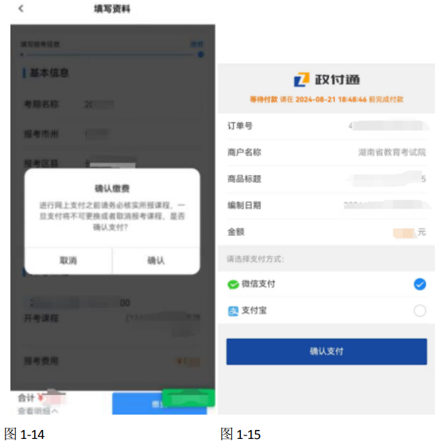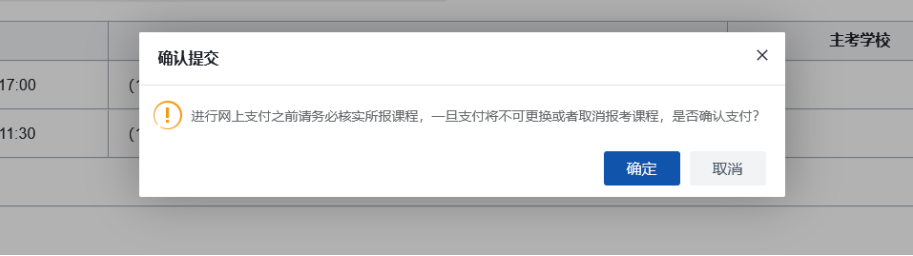 考生须认真再次确认选择的课程信息是否准确无误,如需修改,可点击右下角“上一步”,返回“填写报考资料”界面进行修改;如确认无误,点击右下角“去支付”按钮,系统会弹出“确认支付”弹窗,如下图所示: