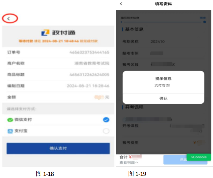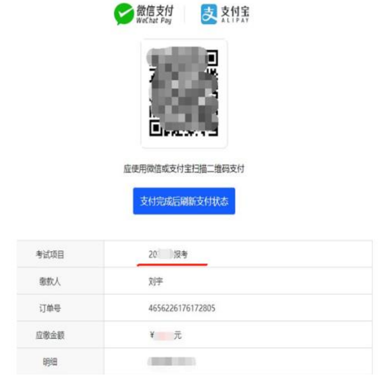 考生使用手机微信或支付宝扫描支付界面上的二维码,按照提示支付所报考课程考试费,如下图所示: