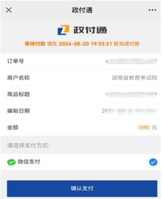 考生应认真阅读完确认提交提示信息,再点击“确定”按钮,系统会弹出支付界面弹窗,如下图所示: