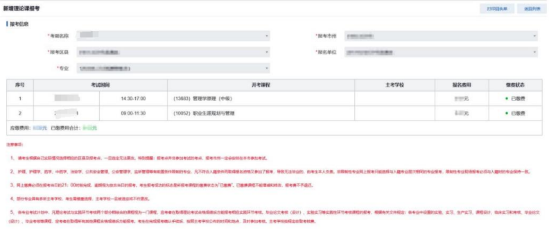 1.请考生缴费前认真核对报考课程,已缴费课程不能增减和修改,报考费不予退还。