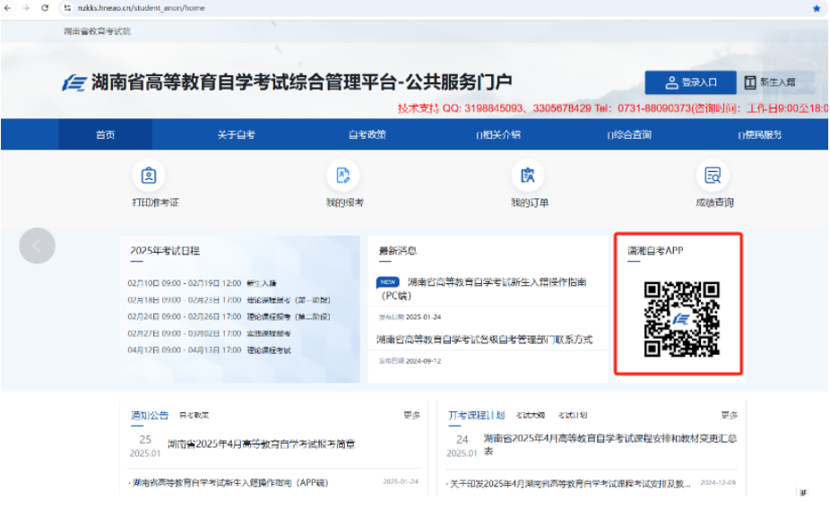 华为、小米、苹果手机在应用商店搜索“潇湘自考”下载安装APP,其他品牌手机可在PC端打开浏览器(推荐使用谷歌浏览器),在地址栏输入“https://nzkks.hneao.cn”后,进入门户首页界面,如图1-1所示,通过手机微信扫一扫上图二维码,下载潇湘自考 APP安装包,并安装,已下载过“潇湘自考”APP的考生,请确认已更新到最新版本。