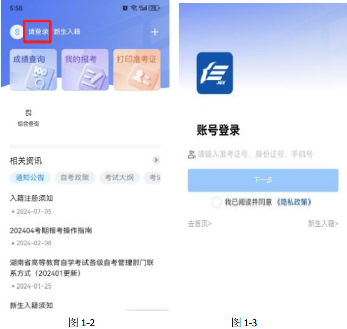 个人手机上,点击安装好的潇湘自考APP图标,进入门户首页,如下图1-2 所示,点击左上角的“请登录”连接,进入登录界面。
