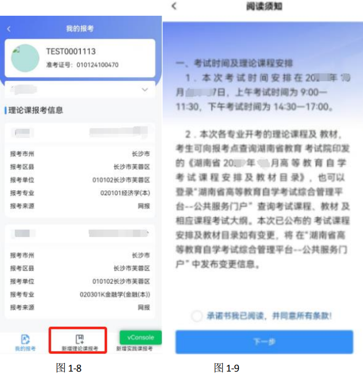 点击上图 1-8 报考界面下方的“新增理论课报考”图标,进入图1-9界面,阅读完阅读须知,并勾选“承诺书我已阅读,并同意所有条款!”再点击“下一步”按钮,进入图1-10界面,选择报考市州、报考区县、报考单位、报考专业及开考课程(报考课程),再点击“下一步”按钮,进入图1-12 界面,点击“确认”按钮,锁定本次报考名额。