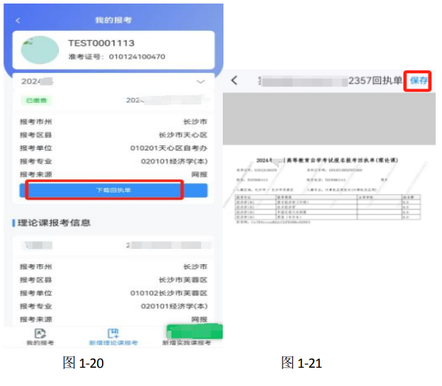 缴费完成后,进入APP,显示下图1-18界面中,点击左上角的“<”按钮,返回报考界面,如下图1-19所示,点击“确认”按钮,进入如图 1-20所示界面,点击“下载回执单”按钮,进入图1-21所示界面,点击右上角的“保存”按钮即可下载回执单至本手机。
