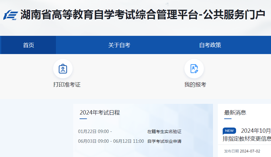 湖南自考自助服务系统官网2024年已经更新为:湖南省高等教育自学考试综合管理平台-公共服务门户