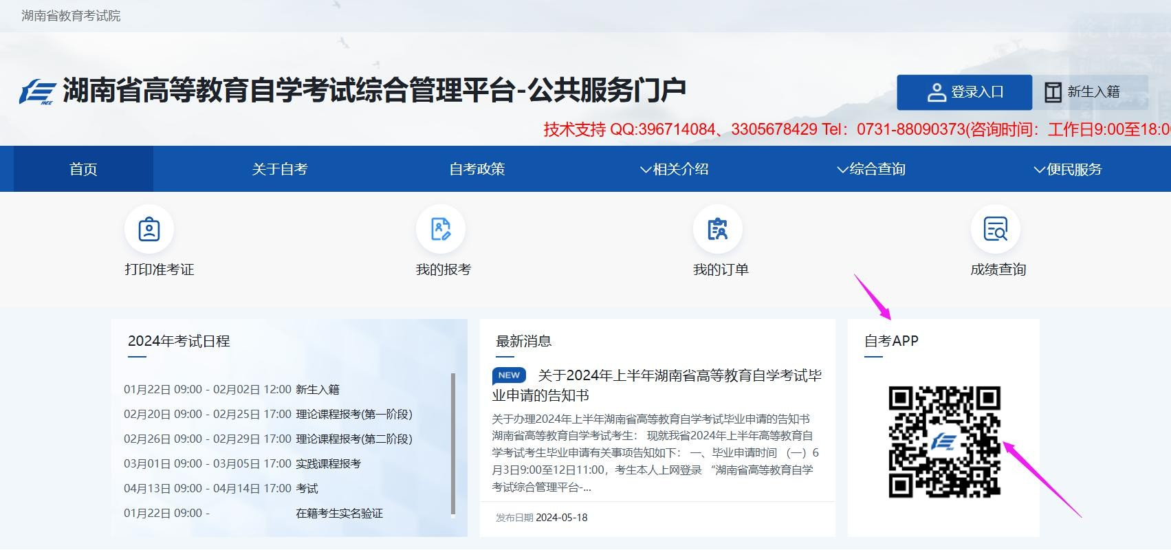 (一)在湖南自考服务平台首页中扫码下载APP,也可以在手机软件中搜索“潇湘自考 APP”下载。