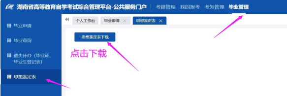 (二)登录湖南自考服务平台在【毕业管理】下载《思想品德鉴定表》,按要求填写并加盖鉴定单位公章。