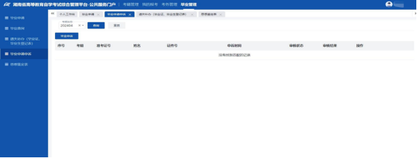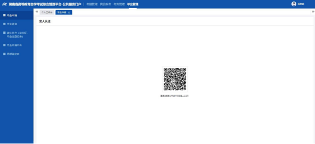 点击【毕业管理】-【毕业申请】菜单,通过潇湘自考APP扫码进行考生身份校验,校验成功后进入考生毕业申请列表界面,可在该界面进行毕业申请。