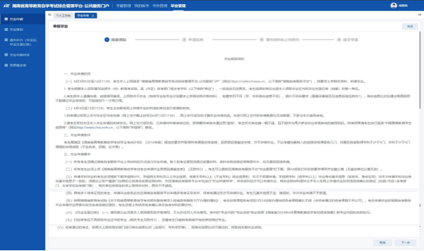 点击【毕业申请】按钮,进入毕业阅读须知界面,请考生仔细阅读。