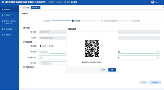 点击【下一步】按钮,进入考生毕业申请信息界面,进行申请信息填写;信息填写完成后点击【学信网校验】按钮,弹出学信网校验二维码,考生可通过学信网 APP 扫码进行学信网信息校验。