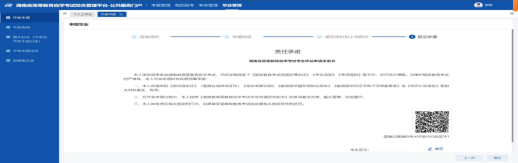考生需要认真核对所有信息,确保准确无误。按说明填写所有合格成绩(未考的选考课程成绩栏不填写)。上传相关附件后,点击【下一步】按钮,进入考生阅读《毕业申请承诺书》并签名界面。考生通过潇湘自考APP 扫码进行签字确认。