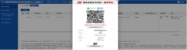 点击【支付】按钮,可对审核通过的毕业申请数据进行缴费。毕业证书审定费请在规定时间内支付,网上支付成功后才算毕业申请完成。未进行网上支付的申请数据为无效数据,不参与本次省级审核。网上支付成功后,凡申请材料被审核过的,即使最终审核未通过而“退档”,考生所交审定费一概不退,且不能作为再次参加毕业申请审核的费用抵扣。