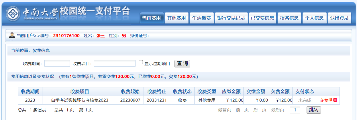 3. 进入交费界面,显示当前费用,请核对编号和姓名,避免误交。