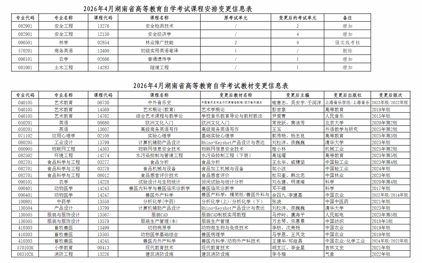 经研究,我院对《2026年4月湖南省高等教育自学考试课程安排及教材目录》公布的少量专业考试课程安排进行调整,并且更新了部分课程的教材版次。现将变更后的课程安排和教材信息汇总公布如下(信息更新截至2026年1月7日)。