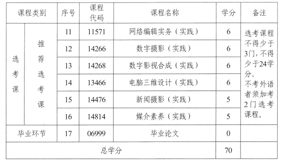 本专业考试课程不得少于13门,总学分不得少于70学分。其中必考课程10门,共计46学分;选考课程不得少于3门,不得少于24学分。考试课程相关的实践考核环节部分不单独计入课程总门数。