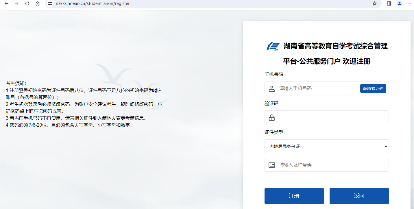 自2024年1月起,启用“湖南省高等教育自学考试综合管理平台-公共服务门户”(https://nzkks.hneao.cn)(以下简称“湖南自考服务平台”)用作湖南自考考生使用的网站,为了更好的服务新入籍考生,特制定本《新生入籍注册操作指南》。