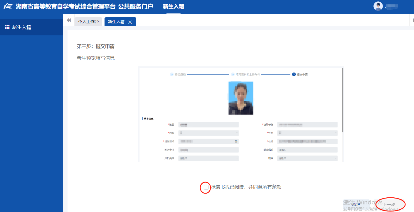 阅读完成《新生报名入籍操作指南》后,勾选界面中显示的“承诺书我已阅读,并同意所有条款。”复选框,弹出如下图所示窗口。