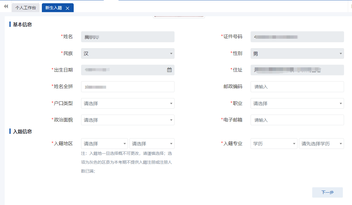 点击“确定”按钮,返回登录界面,用新密码重新登录系统,进入首页,继续进行后续新生入籍操作,如下图所示。