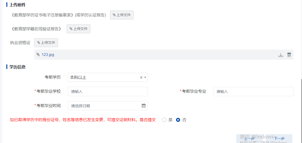 注:如已取得学历中身份证号、姓名等信息发生变更,可选中“是”,弹出的变更前信息中,输入相关信息,提交证明材料,点击“下一步”按钮,弹出如下图所示窗口。