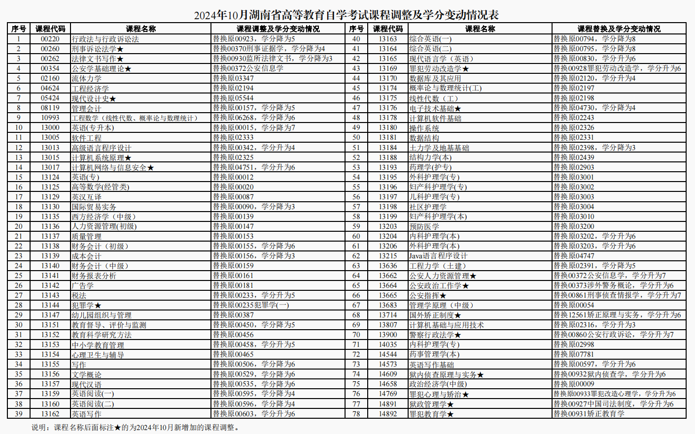 最新2024年10月湖南省高等教育自学考试课程调整及学分变动情况表