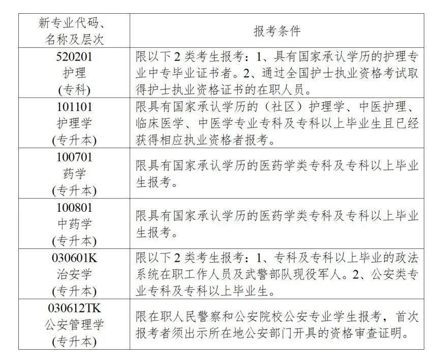 四、报考治安学、公安管理学、护理、护理学、药学、中药学(本)等医学、法学类限制报考专业的新考生必须符合限制性专业报考条件的规定(见附件1)并上传相关证明材料。其中,公安管理学(专升本)专业报考条件调整为只限在职人民警察和公安院校公安专业学生报考。