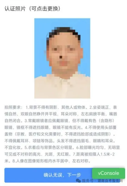 认证照片“点击上传”个人寸照照片,下拉列表可以选择“拍摄”或“从相册选择”(新生入籍时上传的照片将用于考生准考证、毕业证及其他业务,请严格按照图像采集规范及信息标准(见附件 1)要求上传本人近期电子证件照,不符合要求的照片会影响考生的考试及毕业等,由此造成的后果由考生自行承担),寸照上传好后,再点击本页面下方的“确认无误,下一步”按钮,弹出人脸识别验证窗口,如下图所示。