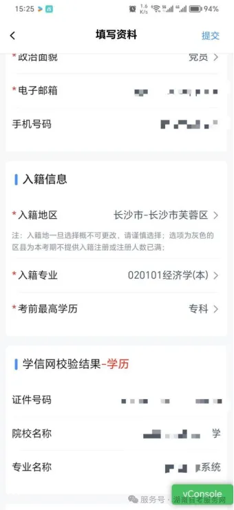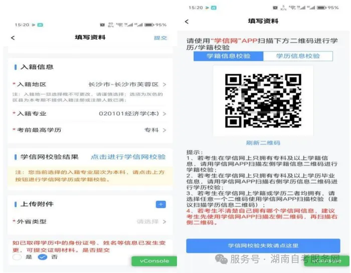 基本信息中输入邮政编码,选择户口类型、职业、政治面貌、输入电子邮箱和手机号码等信息;入籍信息中,选择入籍地区、入籍专业;入籍专业层次为本科专业,请考生点击上图中【点击进行学信网校验】按钮,打开对应的学信网扫描二维码,如下图所示。