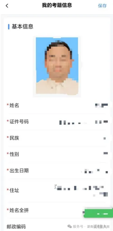 修改相关信息后,点击“保存”按钮即可完成入籍申请,可再次点击左侧“我的考籍信息”菜单查看审核状态。入籍审核通过并产生准考证号后(审核时间截止后再生成准考证号),考生方可登录“湖南自考服务平台”选择专业课程进行报考。