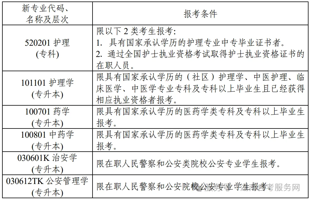 下表所列专业对报考条件、报考程序有特殊限制,考生报考须符合下表具体规定。在考试任何环节发现报考者不符合报考条件的,该考生不论何种原因,都要承担不被承认考试结果、不被受理毕业申请的后果。