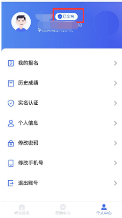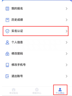 ①实名认证:点击“个人中心”—“实名认证”,点击“认证”,上传身份证正反面,可通过手机相机拍摄或通过相册上传,请注意照片大小和网络顺畅,照片大小不要超过4M。上传成功后系统将自动识别身份证照片信息与注册时填写的姓名与身份证号进行认证,如与注册信息不一致将无法认证,认证通过后再进入考试报名页进行报名。(如:姓名错误可在个人中心-个人信息中修改,身份证号错误请联系技术管理员)