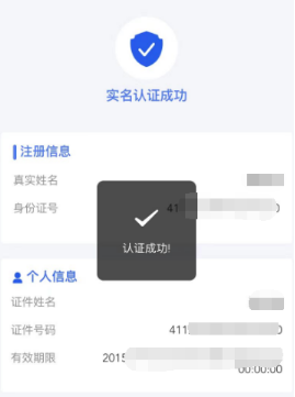 ②信息匹配成功之后,系统会提示认证成功,返回个人信息页面会提示已实名。