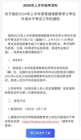 以上就是关于《湖南涉外经济学院高等学历继续教育学士学位外语考试报名操作手册》的全部内容,想了解更多湖南自考资讯,请持续关注《湖南自考网》。如有需要,考生可点击《湖南自考网助学报名入口》进行报名,或点击添加《招生老师微信》进行咨询解答和报名服务哦~