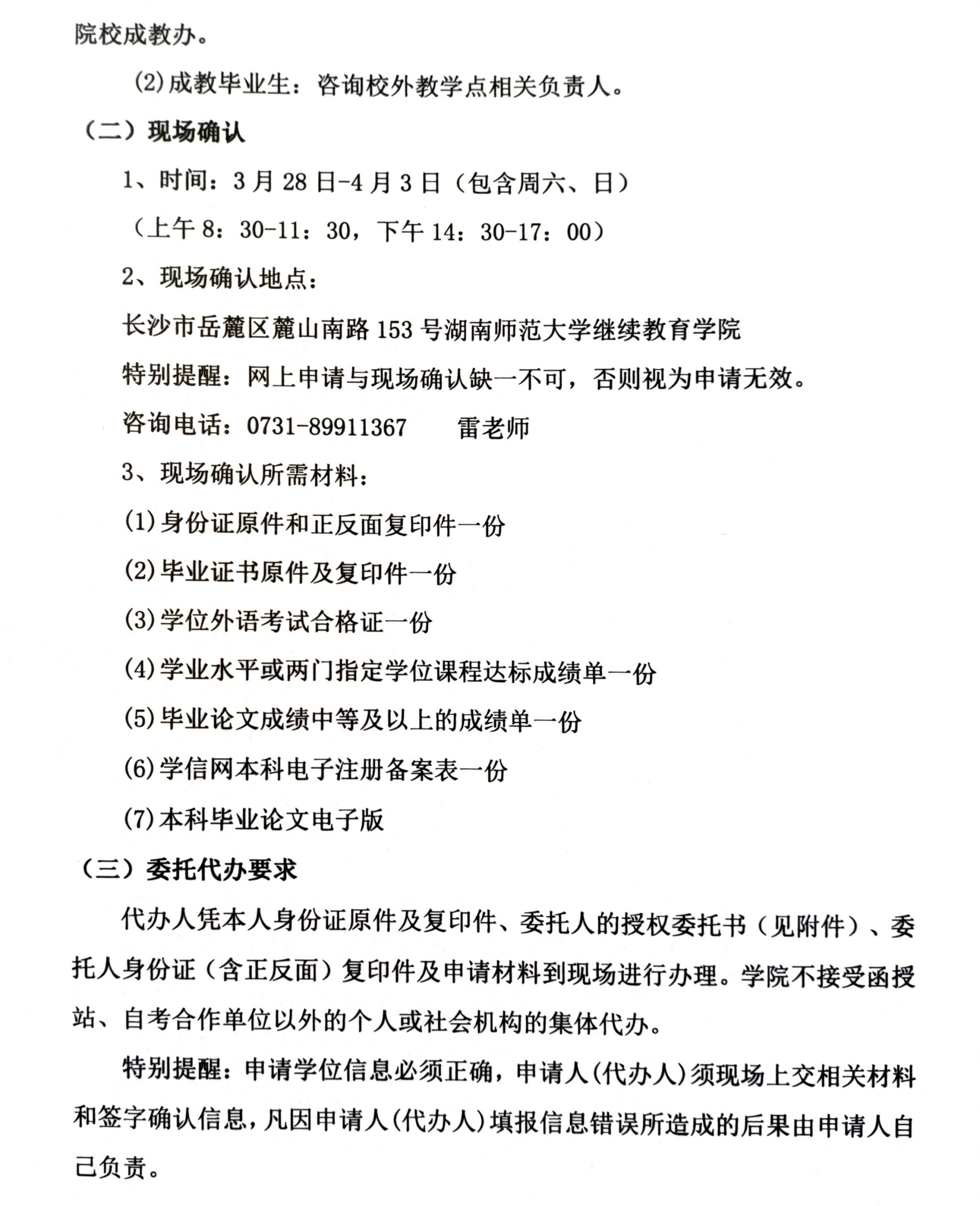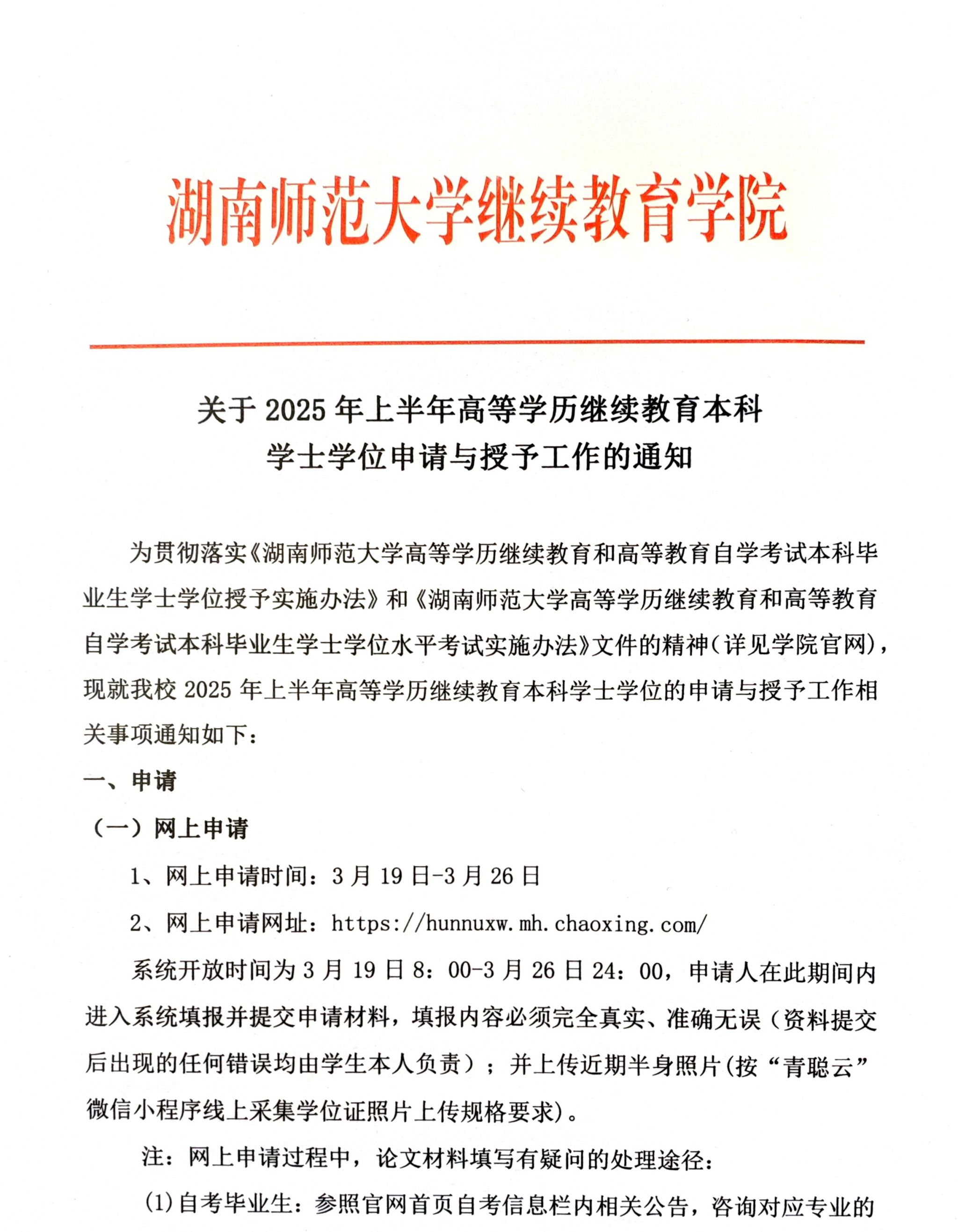 为贯彻落实《湖南师范大学高等学历继续教育和高等教育自学考试本科毕业生学士学位授予实施办法》和《湖南师范大学高等学历继续教育和高等教育自学考试本科毕业生学士学位水平考试实施办法》文件的精神(详见学院官网),现就我校2025年上半年高等学历继续教育本科学士学位的申请与授予工作相关事项通知如下: