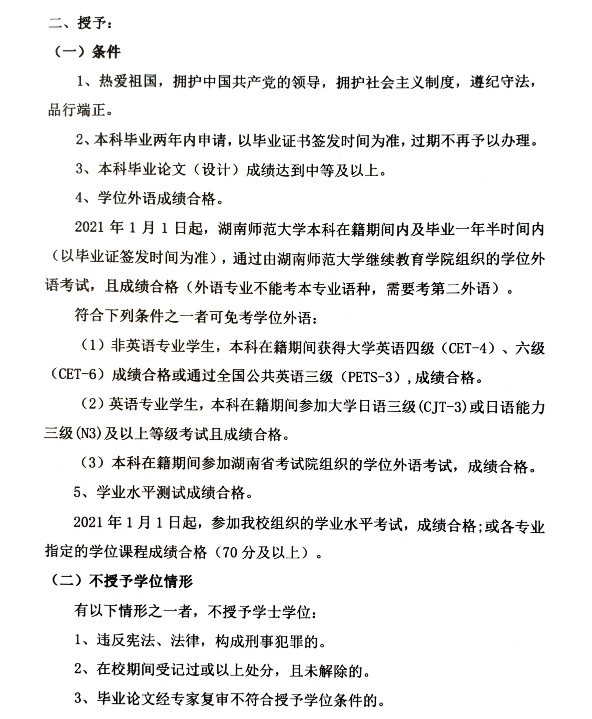 2021年1月1日起,湖南师范大学本科在籍期间内及毕业一年半时间内(以毕业证签发时间为准),通过由湖南师范大学继续教育学院组织的学位外语考试,且成绩合格(外语专业不能考本专业语种,需要考第二外语)。符合下列条件之一者可免考学位外语: