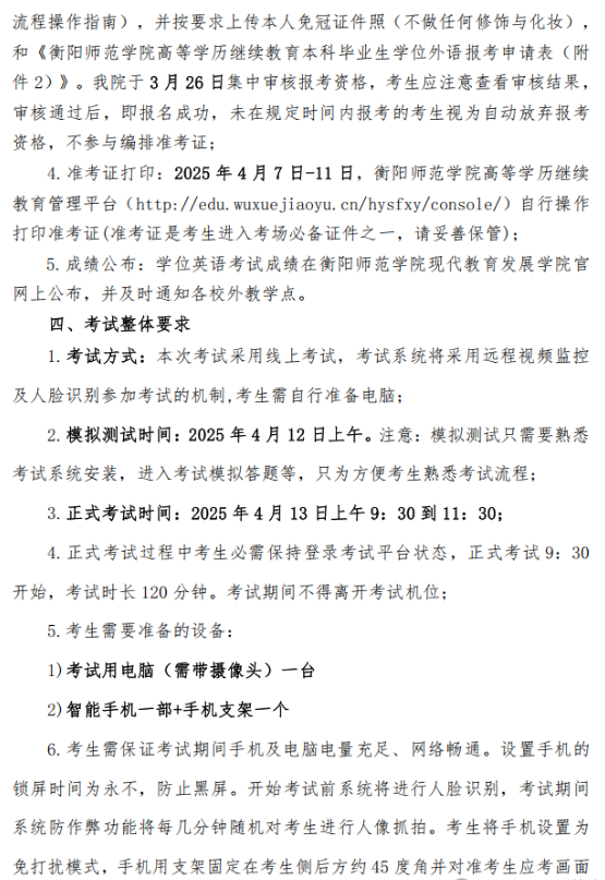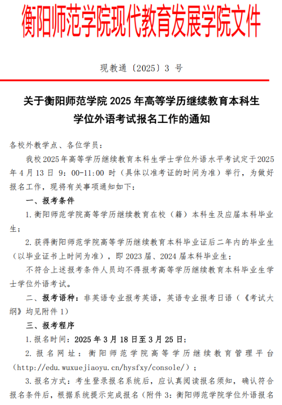 关于衡阳师范学院2025年高等学历继续教育本科生学位外语考试报名工作的通知
