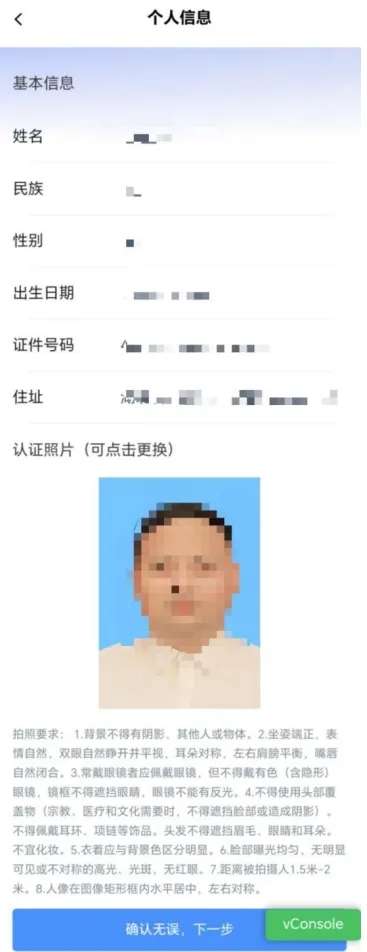 分别点击头像面、国徽面,弹出的下拉菜单可以选“拍摄”或“从相册选择”上传身份证照片,上传成功后,点击下方的“上传完成请核对信息”按钮,打出如下图所示窗口。