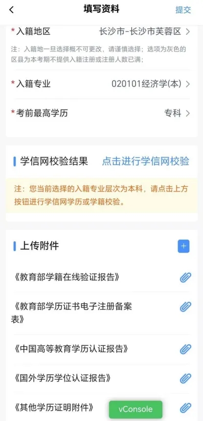 注意:学信网效验未通过无反馈信息的考生,请点击右下方【学信网校验失败请点这里】按钮,关闭学信网扫码界面;手动上传附件资料,出现如下图界面,在下图所示附件中,上传相关附件资料(点击每个附件名称后方图标按钮即可上传附件信息)。