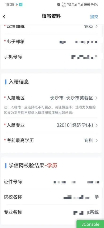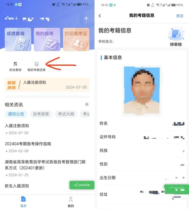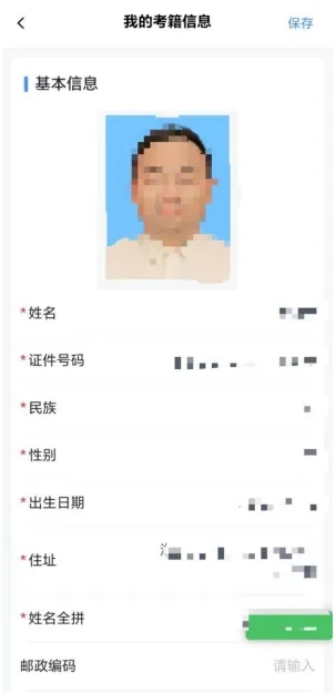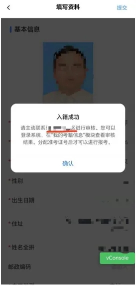 该界面可以查询审核结果,入籍信息未审核前,可以点击右上角“修改”按钮,打开修改考籍信息界面,如下图所示。