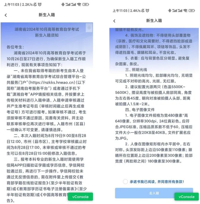 人脸实人核验通过后,跳转到入籍须知界面,考生认真阅读完《新生入籍须知》后,勾选界面中显示的“承诺书我已阅读,并同意所有条款”;点击底部“去入籍”按钮,跳转到入籍页面。