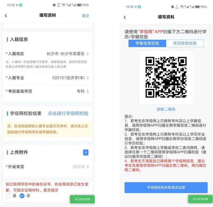 若考生不清楚自身学籍或学历情况,建议考生先扫描左侧二维码再扫描右侧二维码),每个码只能扫一次,再次扫码时须刷新对应的校验二维码。